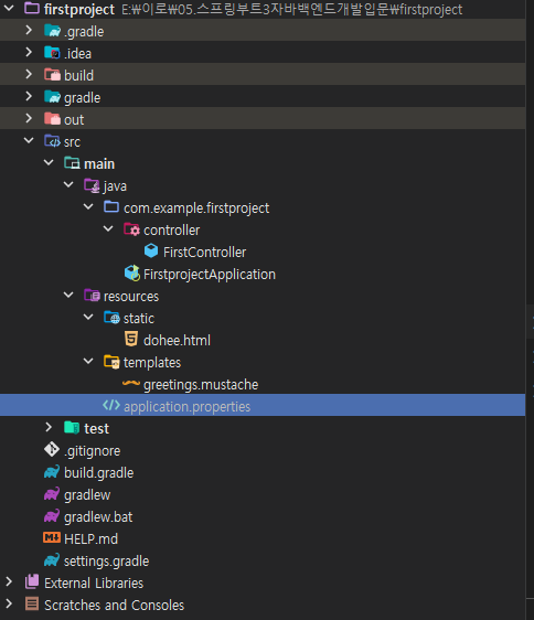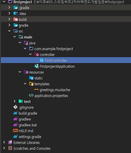 src > main > java ๋๋ ํฐ๋ฆฌ์ ๊ธฐ๋ณธ ํจํค์ง com.example.firstproject๊ฐ ์กด์ฌํ๋ค.