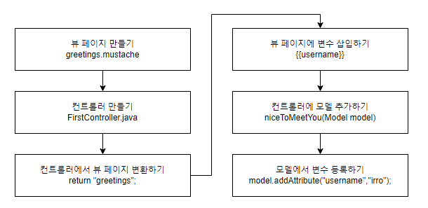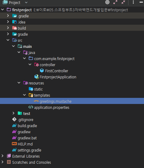 return "greetings"; ๋ก ์ ์ด ์ฃผ๋ฉด ์๋ฒ๊ฐ ์์์ templates ๋๋ ํฐ๋ฆฌ์์ greetings.mustache ํ์ผ์ ์ฐพ์ ์น ๋ธ๋ผ์ฐ์ ๋ก ์ ์กํ๋ค.